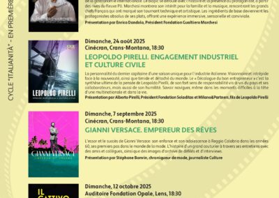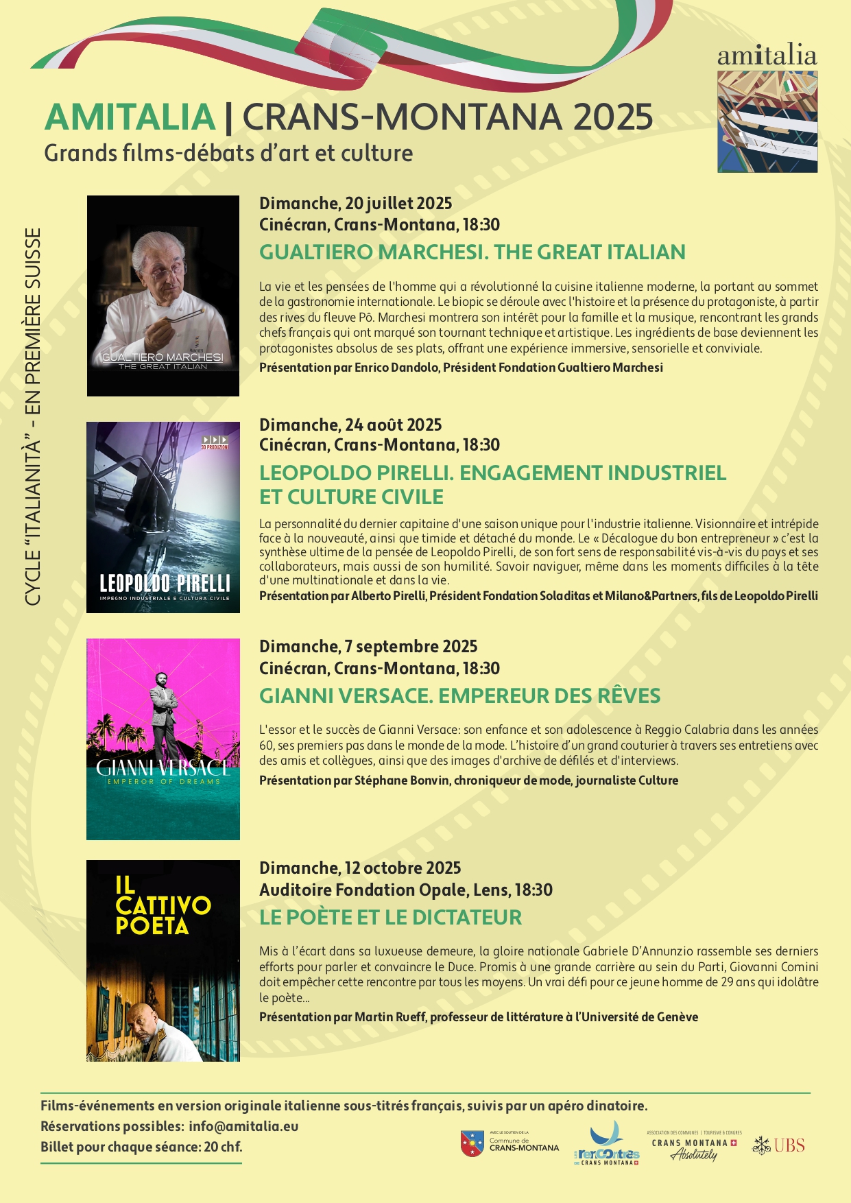 Dall’estate 2021, con la riapertura delle sale cinematografiche, sono state organizzate nuove rassegne tematiche riscuotendo crescente successo a Crans-Montana, sede dell’Associazione, a Ginevra e a Losanna.
